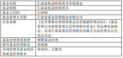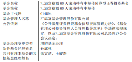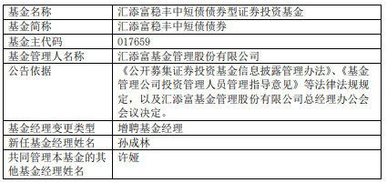 汇中国经济网北京10月27日讯 近日,汇添富基金公告,汇添富稳益60天持有债券、汇添富稳福60天滚动持有中短债、汇添富稳丰中短债债券、汇添富收益快线货币增聘孙成林。