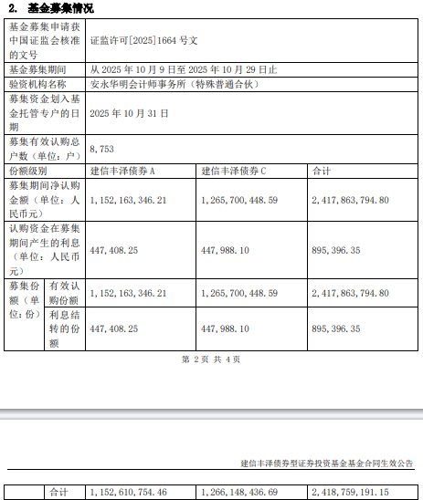 建信丰泽债券成立 规模24亿元