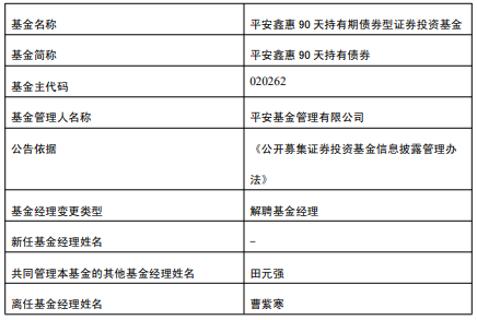 中国经济网北京11月3日讯 近日,平安基金公告,曹紫寒离任平安鑫惠90天持有债券、平安元福短债发起式。