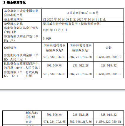 募集期间净认购金额1,558,594,902.19元,认购资金在募集期间产生的利息628,018.32元,募集份额合计1,559,222,920.51份。