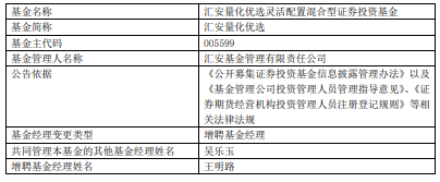 中国经济网北京11月5日讯 今日,汇安基金公告,汇安量化优选增聘王明路。