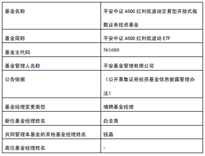中国经济网北京11月6日讯 今日,平安基金公告,平安中证A500红利低波动ETF增聘白圭尧。