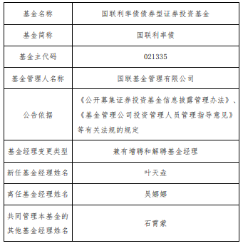 中国经济网北京11月6日讯 昨日,国联基金公告,国联利率债增聘叶天垚,吴娜娜离任。