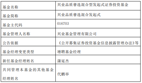中国经济网北京11月10日讯 近日,兴业基金公告,兴业品质睿选混合发起式增聘蒲延杰。