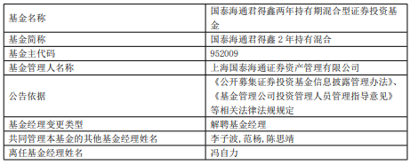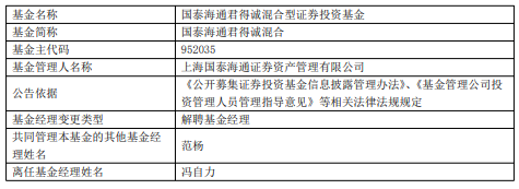 中国经济网北京11月13日讯 今日,上海国泰海通证券资产管理公告,冯自力离任国泰海通君得诚混合、国泰海通君得鑫2年持有混合、国泰海通新材料混合发起。