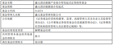 中国经济网北京11月14日讯 今日,鑫元基金公告,张汉毅离任鑫元清洁能源混合发起式、鑫元鑫新收益。