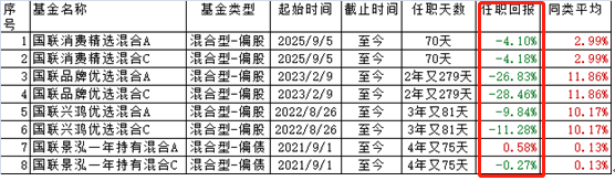 钱文成目前在管基金共有8只(各份额分开计算,下同),截至2025年11月14日,时间最短的仅有70天,最长的超过4年,然而从任职回报看,全部跑输同类产品均值。管理时间最长的国联景泓一年持有混合A/C在钱文成的操作下累计收益率为0.58%、-0.27%。2023年2月成立的国联品牌优选混合A、国联品牌优选混合C是钱文成目前在管基金中任职回报亏损最多的,不到3年时间亏损幅度接近3成。