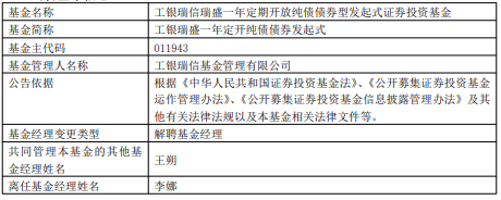 李娜离任工银瑞盛一年定开纯债债券发起式