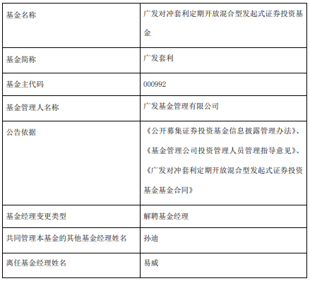 易威离任广发对冲套利定期开放混合 孙迪管理