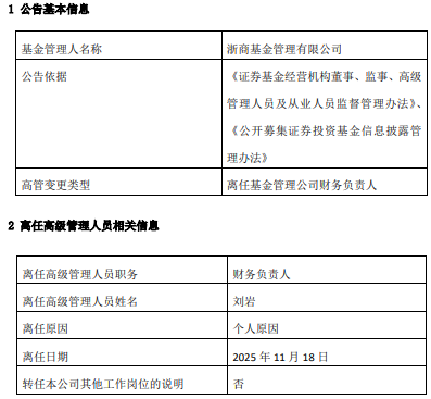 中国经济网北京11月21日讯 昨日,浙商基金公告,财务负责人刘岩因个人原因离任。