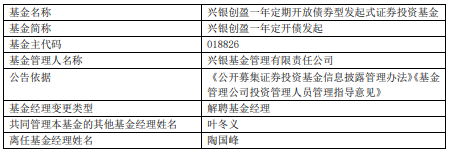 陶国峰离任兴银创盈一年定开债发起 叶冬义管理