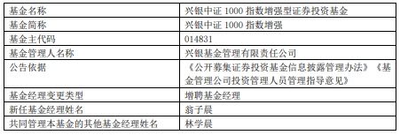中国经济网北京11月21日讯 近日,兴银基金公告,兴银中证1000指数增强增聘翁子晨。