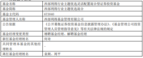 中国经济网北京11月24日讯 近日,西部利得基金公告,西部利得行业主题优选混合增聘何奇,袁朔、周平离任。