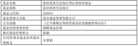 中国经济网北京11月24日讯 今日,泰信基金公告,泰信优质生活混合增聘陈颖。