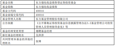 中国经济网北京11月25日讯 今日,东方基金公告,东方强化收益债券增聘吴萍萍。