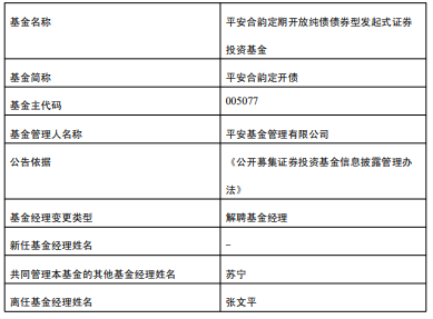 中国经济网北京11月25日讯 今日,平安基金公告,张文平离任平安合韵定开债。