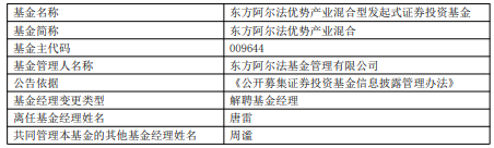 中国经济网北京11月26日讯 今日,东方阿尔法基金公告,唐雷离任东方阿尔法优势产业混合。