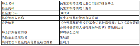 朱辰喆离任民生加银持续成长混合