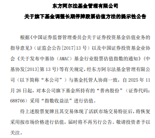 公告称,自2025年11月26日起,对该公司旗下基金所持有的“普冉股份”(证券代码:688766)采用“指数收益法”进行估值。