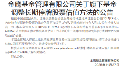 公告称,根据中国证监会《关于证券投资基金估值业务的指导意见》(证监会公告[2017]13号),为使持有长期停牌股票的基金估值更加公平、合理,更好地维护持有人利益,经与托管人协商一致,基金管理人自2025年11月26日起对旗下基金所持有的普冉股份(股票代码:688766)采用中国证券业协会基金估值工作小组《关于停牌股票估值的参考方法》中的“指数收益法”估值。