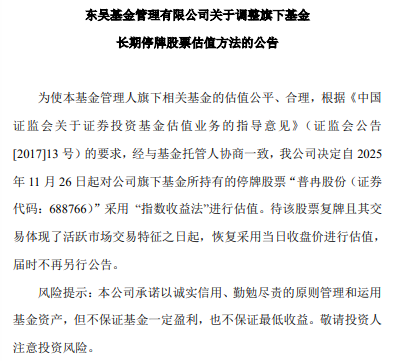公告称,为使本基金管理人旗下相关基金的估值公平、合理,根据《中国证监会关于证券投资基金估值业务的指导意见》(证监会公告[2017]13号)的要求,经与基金托管人协商一致,决定自2025年11月26日起对公司旗下基金所持有的停牌股票“普冉股份(证券代码:688766)”采用 “指数收益法”进行估值。待该股票复牌且其交易体现了活跃市场交易特征之日起,恢复采用当日收盘价进行估值,届时不再另行公告。