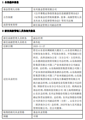 中国经济网北京11月28日讯 今日,东兴基金公告,任命曲冬松为副总经理。