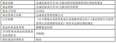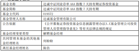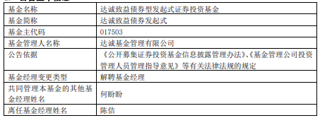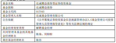 中国经济网北京11月28日讯 今日,达诚基金公告,陈佶离任达诚中证同业存单AAA指数7天持有期、达诚定海双月享60天滚动持有短债、达诚致益债券发起式、达诚腾益债券
