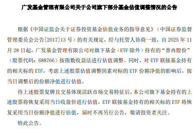 根据《中国证监会关于证券投资基金估值业务的指导意见》(中国证券监督管理委员会公告[2017]13 号)的有关规定,经与托管人协商一致,自2025年11月28日起,广发基金管理有限公司对旗下基金(ETF除外)持有的“普冉股份”(股票代码:688766)按指数收益法进行估值调整。同时,对ETF联接基金持有的相关标的ETF,考虑上述股票估值调整因素对标的ETF份额净值的影响后,按当日调整后的份额净值进行估值。