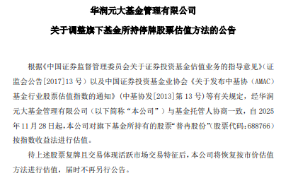 根据《中国证券监督管理委员会关于证券投资基金估值业务的指导意见》(证监会公告[2017]13号)以及中国证券投资基金业协会《关于发布中基协(AMAC)基金行业股票估值指数的通知》(中基协发[2013]第13号)等有关规定,经华润元大基金管理有限公司与基金托管人协商一致,自2025年11月28日起,公司对旗下基金所持有的股票“普冉股份”(股票代码:688766)按指数收益法进行估值。