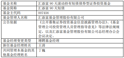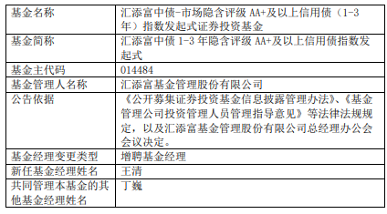 中国经济网北京12月2日讯 今日,汇添富基金公告,汇添富90天短债、汇添富中债1-3年隐含评级AA+及以上信用债指数发起式增聘王清。