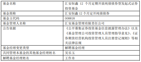中国经济网北京12月2日讯 今日,汇安基金公告,王作舟离任汇安恒鑫12个月定开纯债债券、汇安裕宏利率债债券、汇安嘉汇纯债债券、汇安短债债券、汇安中证同业存单AAA指数7天持有期、汇安中短债债券、汇安永福90天持有期中短债债券、汇安永利30天持有期短债 。