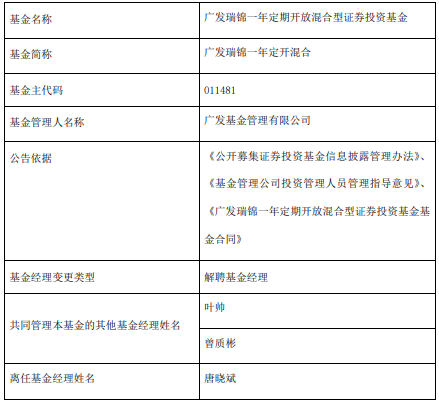 中国经济网北京12月3日讯 今日,广发基金公告,唐晓斌离任广发瑞锦一年定开混合。