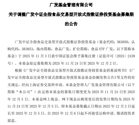 公告称,广发中证全指食品交易型开放式指数证券投资基金(基金代码:563850;认购代码:563853;场内简称:食品广发;扩位简称:食品ETF广发;以下简称本基金)于2025年11月3日获中国证监会准予募集注册(证监许可〔2025〕2439号)。