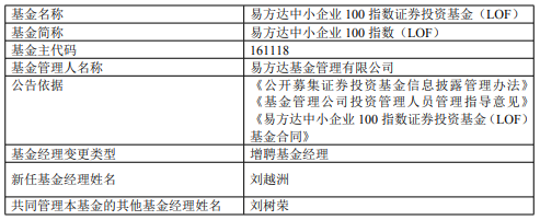 中国经济网北京12月3日讯 今日,易方达基金公告,易方达中小企业100指数(LOF)增聘刘越洲。