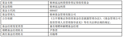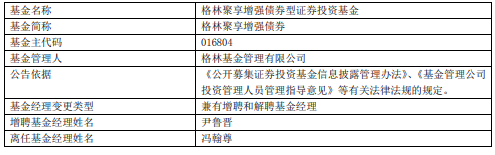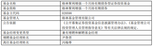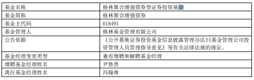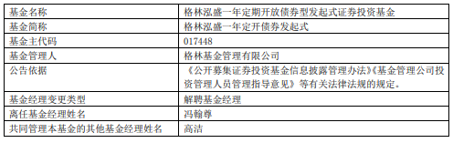 中国经济网北京12月4日讯 今日,格林基金公告,冯翰尊离任格林聚利增强一个月持有期债券、格林聚合增强债券、格林泓远纯债、格林聚享增强债券、格林泓盛一年定开债券发起式。