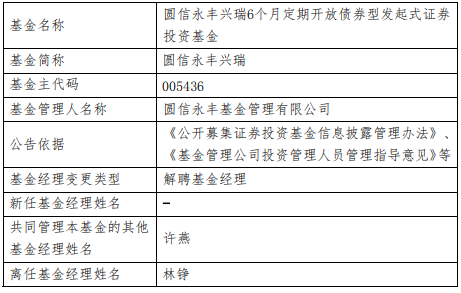 中国经济网北京12月4日讯 今日,圆信永丰基金公告,林铮离任圆信永丰兴瑞,许燕管理。