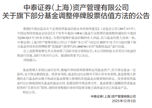 公告称,根据《中国证监会关于证券投资基金估值业务的指导意见》(证监会公告〔2017〕13号)、中国证券投资基金业协会《关于发布中基协(AMAC)基金行业股票估值指数的通知》(中基协发[2013]13号)的有关规定,为更好地维护基金份额持有人利益,经与基金托管人协商一致,中泰证券(上海)资产管理有限公司决定自2025年12月3日起对旗下部分基金所持有的停牌股票“思瑞浦”(股票代码:688536)采用“指数收益法”进行估值。