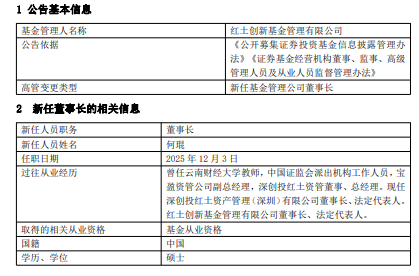 中国经济网北京12月8日讯 近日,红土创新基金公告,任命何琨为董事长。