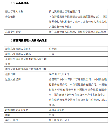 中国经济网北京12月8日讯 近日,信达澳亚基金公告,任命方敬为总经理,不再担任副总经理职务。