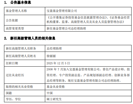中国经济网北京12月8日讯 近日,宝盈基金公告,任命徐丽丽为总经理助理。