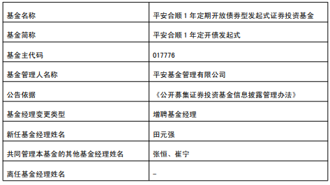 中国经济网北京12月8日讯 近日,平安基金公告,平安合顺1年定开债发起式增聘田元强。