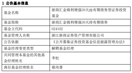 中国经济网北京12月9日讯 今日,浙商证券资管公告,蔡玮菁离任浙商汇金锦利增强30天持有期债券。