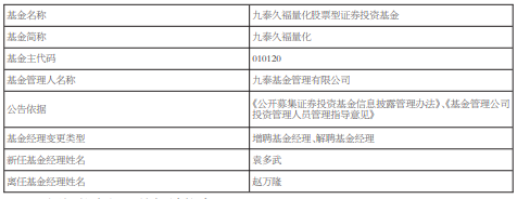 中国经济网北京12月11日讯 今日,九泰基金公告,九泰久福量化增聘袁多武,赵万隆离任。