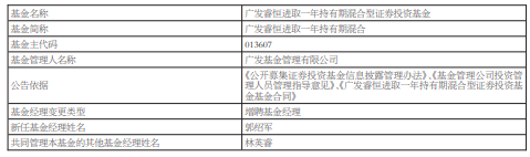 中国经济网北京12月11日讯 今日,广发基金公告,广发睿恒进取一年持有期混合增聘郭绍军。