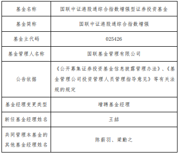 中国经济网北京12月12日讯 今日,国联基金公告,国联中证港股通综合指数增强增聘王喆。