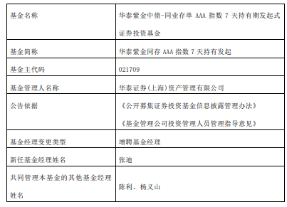 中国经济网北京12月12日讯 今日,华泰证券(上海)资产管理有限公司公告,华泰紫金同存AAA指数7天持有发起增聘张迪。