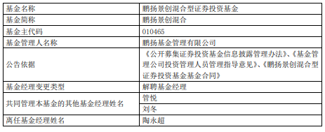 中国经济网北京12月12日讯 今日,鹏扬基金公告,陶永超离任鹏扬稳利债券、鹏扬景创混合。