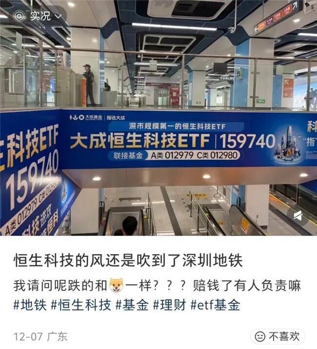 近日,有网友在社交平台晒图,深圳地铁某站内出现大成恒生科技ETF基金的宣传广告。图片中,深圳某地铁站扶梯上方横梁处及侧面印着大成基金的广告,上面醒目地写着大成基金恒生科技ETF在场内和场外交易的代码,并在广告上方部分标注着“深市规模第一的恒生科技ETF”字样。