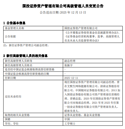 中国经济网北京12月15日讯 近日,国投证券资产管理公告,任命张振宇为副总经理。
