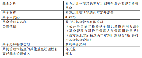 中国经济网北京12月15日讯 近日,易方达基金公告,郑希离任易方达北交所精选两年定开混合,邱天蓝管理。